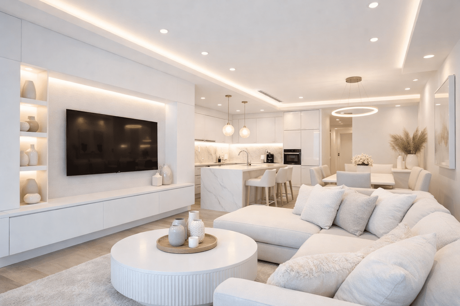 Nos réalisations en faux plafonds illustrent notre créativité technique. Plafonds à plusieurs niveaux, intégration de rubans LED, jeux de lumière indirecte — nous créons des ambiances uniques qui valorisent chaque espace. Ces projets sont particulièrement appréciés dans les séjours, les chambres et les espaces d’accueil.